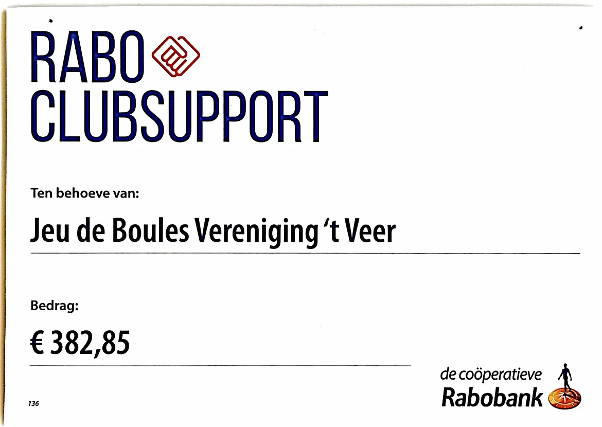 Op 10 oktober 2025 werd het resultaat van de jaarlijkse Rabo ClubSupport-actie bekendgemaakt. Dankzij de stemmen van leden en de steun van de Rabobank heeft Jeu de Boules Het Veer dit jaar een bedrag van € 382,85 ontvangen.